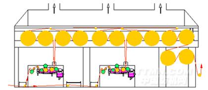 ASGA365H型漿紗機工藝流程示意圖(高架水平布局預烘烘燥機構+雙浸三壓式上漿機構)