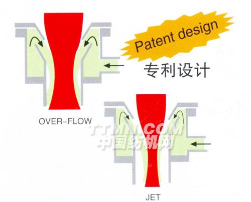 獨特角度設計的噴嘴,配合提布滾筒,實現(xiàn)溢流式的運布方式,織物以自然狀態(tài)浮游于噴嘴中,避免起毛現(xiàn)象。