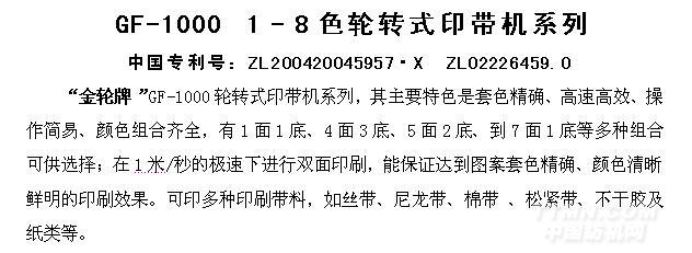 您所在的位置:紡機(jī)網(wǎng) >> 肇慶市金輝印刷機(jī)械有限公司 >> GF--1000 1--8色輪轉(zhuǎn)式印帶機(jī)系列