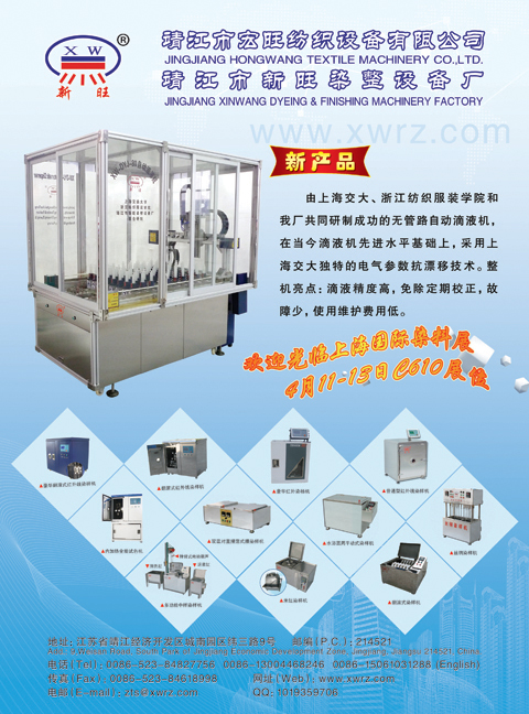 本廠專業生產染整設備。近年來,企業倡導科技創新,注重掌握現代先進技術,產品逐年不斷開發與更新,獲多項國家專利,填補了國內空白。高效、低耗、環保、自控程度高的新一代高溫、常溫旋轉、平動式紅外線等系列染樣機產品,以其卓越領先之性能,博得了國內外廣大用戶的贊譽。目前我廠產品已出口日本,俄羅斯,意大利,印度,巴基斯坦,孟加拉國,土耳其,埃及,哥倫比亞,巴西,烏拉圭等國家。