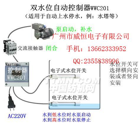 WWC201 當(dāng)水到達(dá)低水位開(kāi)關(guān)位置時(shí),控制器內(nèi)繼電器閉合,水上升時(shí),繼電器繼續(xù)保持閉合狀態(tài),直到水到達(dá)高水位開(kāi)關(guān)位置時(shí),繼電器斷開(kāi)。水下降時(shí),繼電器繼續(xù)保持斷開(kāi)狀態(tài),直到到達(dá)低水位開(kāi)關(guān)位置時(shí),繼電器閉合。如此不斷循環(huán)……